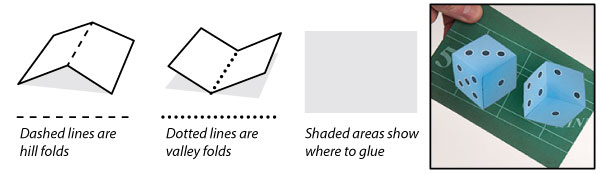 The secret of the illusion is that the dice are actually assembled inside out. Glue together the two dice inside out as shown above.