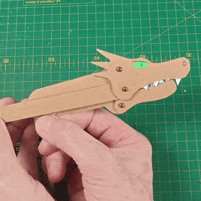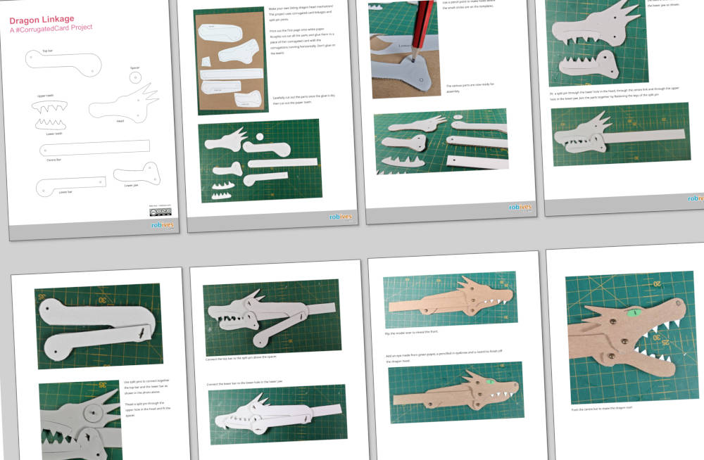 Designed originally as a prototype for a 3D paper‑dragon project, this little build turned out to be an intriguing mechanism in its own right. Using nothing more than corrugated card and a handful of split pins, you can make your own roaring dragon with a ferocious bite!